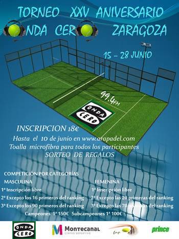 Ayer dio comienzo una nueva prueba puntuable para el ranking aragonés absoluto y el ranking nacional de pádel: el Torneo XXV Aniversario Onda Cero Zaragoza. Uno de los torneos con más tradición del calendario y que, además, goza de gran aceptación: hasta 63 parejas – 38 masculinas y 25 femeninas – y 126 jugadores/as competirán por alcanzar la final en las 3 categorías masculinas y las 3 femeninas que se han organizado en la lucha por el número 1 de Aragón 2015.