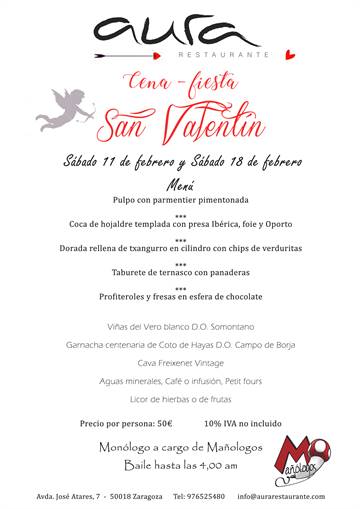Para abrir boca, el Aura Restaurante nos ofrece dos cenas-bailes de San Valentín con monólogos incluidos.