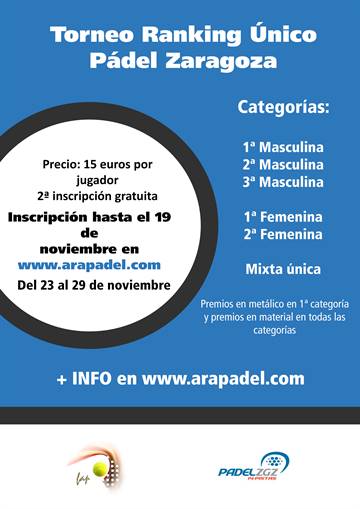 El ranking aragonés está al rojo vivo. La lucha por los primeros puestos de la clasificación y por meterse en el Máster es tremenda y una de las últimas citas de esta pugna se ha celebrado en las instalaciones de Pádel Zaragoza del 23 al 29 de noviembre. Esta competición, puntuable para el ranking nacional y autonómico, así como para la clasificación para el Máster de Aragón, ha contado con un total de 64 parejas: 40 masculinas, 18 femeninas y 6 mixtas.
