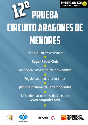 La duodécima – y última – prueba del Circuito Aragonés de Menores se celebra este fin de semana en Regal Pádel Club. Un total de 61 parejas compiten para alcanzar los mejores puestos posibles antes del Máster de Aragón.
