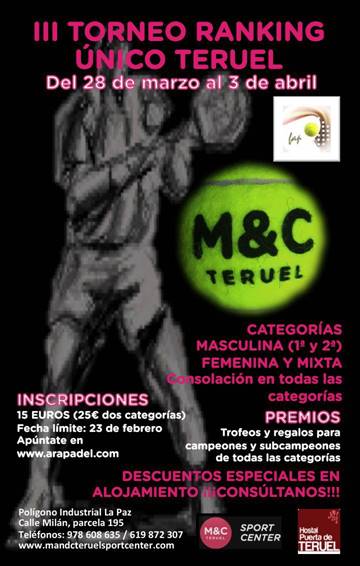 El III Torneo Ranking Único de Teruel, que se celebra en el M&C Teruel comienza esta semana y contará con 17 parejas masculinas, 8 femeninas y 5 mixtas. Puntuable para el ranking aragonés y la clasificación para el Máster de Aragón, es la 5ª prueba puntuable del año 2016. Así, los inscritos buscan escalar puestos en el ranking que les vayan asegurando puestos en el Máster de final de temporada o la participación en el World Pádel Tour de octubre, que se disputa en Pádel Zaragoza y en el Príncipe Felipe y en el que los jugadores locales querrán estar presentes.