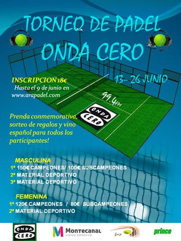 Estos días se está disputando en las instalaciones de Montecanal CD el tradicional Torneo Onda Cero. Esta prueba, la decimotercera de la temporada, cuenta con 31 parejas masculinas y 19 femeninas distribuidas en 5 categorías.